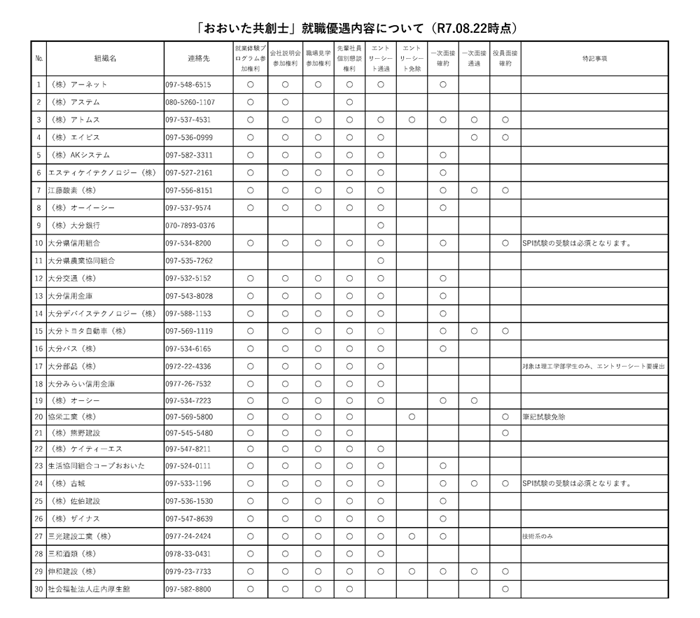 「おおいた共創士」就職優遇内容について(R7.08.22現在)